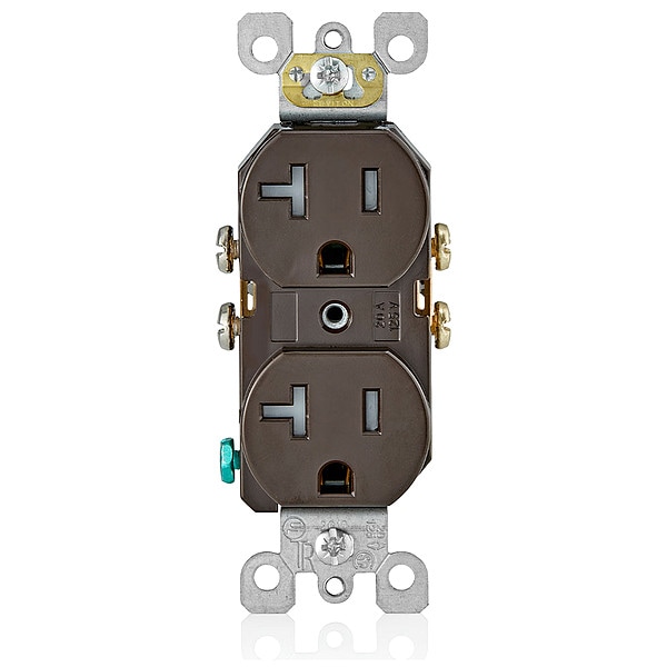 Receptacle, Connection Orientation Straight, Cover Type No Cover, Current Rating 20 A, GFCI No, Grounding Grounded, Hazardous Location Specification Not Applicable, Housing Color Brown, Housing Material Thermoplastic Nylon, Mount Type Flush, NEMA Enclosure Rating Not Rated, NEMA Receptacle Configuration 5-20R, Number of Poles 2, Number of Wires 3, Phase Single, Polarized Yes, Receptacle Type Duplex, Resistance Properties Tamper Resistant
