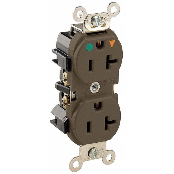 Receptacle, Connection Orientation Straight, Cover Type No Cover, Current Rating 20 A, GFCI No, Grounding Isolated Ground, Hazardous Location Specification Not Applicable, Housing Color Brown, Housing Material PBT Thermoplastic Polyester, Mount Type Flush, NEMA Enclosure Rating Not Rated, NEMA Receptacle Configuration 5-20R, Number of Poles 2, Number of Wires 3, Phase Single, Polarized Yes, Receptacle Type Duplex, Resistance Properties Not Applicable