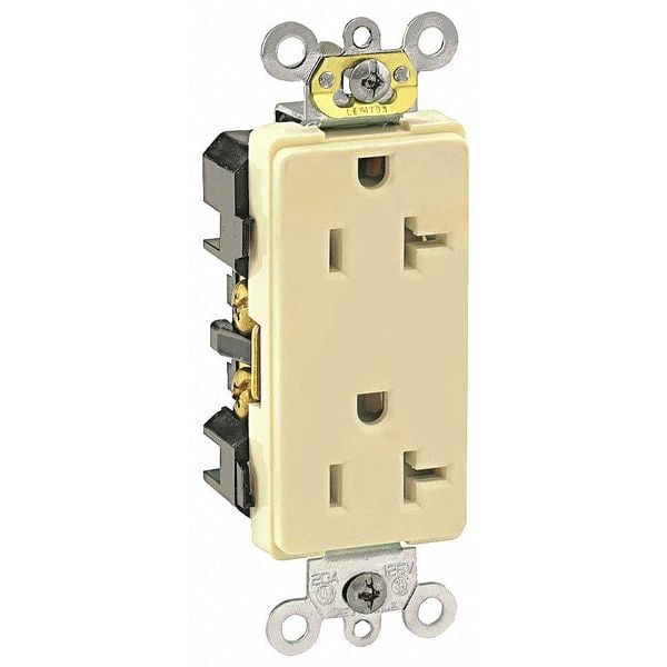 Receptacle, Connection Orientation Straight, Cover Type No Cover, Current Rating 20 A, GFCI No, Grounding Grounded, Hazardous Location Specification Not Applicable, Housing Color Ivory, Housing Material Thermoplastic, Mount Type Flush, NEMA Enclosure Rating Not Rated, NEMA Receptacle Configuration 5-20R, Number of Poles 2, Number of Wires 3, Phase Single, Polarized Yes, Receptacle Type Decorator Duplex, Resistance Properties Not Applicable