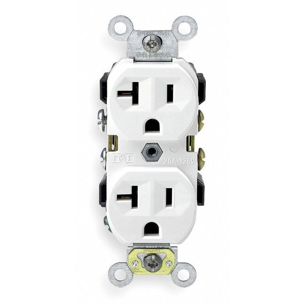 Receptacle, Connection Orientation Straight, Cover Type No Cover, Current Rating 20 A, GFCI No, Grounding Grounded, Hazardous Location Specification Not Applicable, Housing Color White, Housing Material Thermoplastic, Mount Type Flush, NEMA Enclosure Rating Not Rated, NEMA Receptacle Configuration 5-20R, Number of Poles 2, Number of Wires 3, Phase Single, Polarized Yes, Receptacle Type Duplex, Resistance Properties Not Applicable