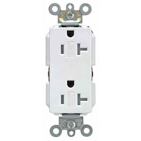 Receptacle, Connection Orientation Straight, Cover Type No Cover, Current Rating 20 A, GFCI No, Grounding Grounded, Hazardous Location Specification Not Applicable, Housing Color White, Housing Material PBT Polyester, Mount Type Flush, NEMA Enclosure Rating Not Rated, NEMA Receptacle Configuration 5-20R, Number of Poles 2, Number of Wires 3, Phase Single, Polarized Yes, Receptacle Type Decorator Duplex, Resistance Properties Tamper Resistant