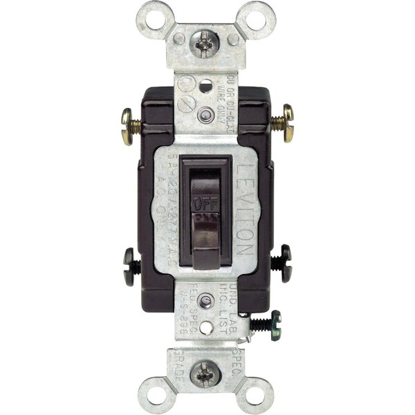 Commercial Specification Grade. Long-life toggle switch with captive mounting screws for fast installation. Large-head terminal screws backed out and staked for fast side wiring of up to No. 10 copper wire. Heavy-gauge rust-resistant steel mounting strap break-off plaster ears for best alignment. Large silver-cadmium oxide contacts insure long life. 20A-120/277V; 1 HP at 120V 2 HP at 240V. UL (Underwriters Laboratories) listed.