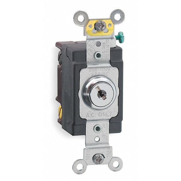 Wall Switch, Current Rating 20 A, Illuminated No, Pilot Light No, Switch Function Maintained, Switch Type Single Pole, Voltage Rating 120/277V AC, Wiring Method Back, Side, Horsepower Rating 2 hp, Locking Style Barrel Key, Maximum Wire Size 10 AWG, Minimum Wire Size 14 AWG, Mount Hole Center-to-Center Height 2.2 in, Nightlight No, Number of Switches 1, Standards ANSI C-73, CSA Certified C22.2 No.111: File #152105, NEMA WD-6, NEMA WD-1, UL 20, Strap Material Steel, Switch Style Locking