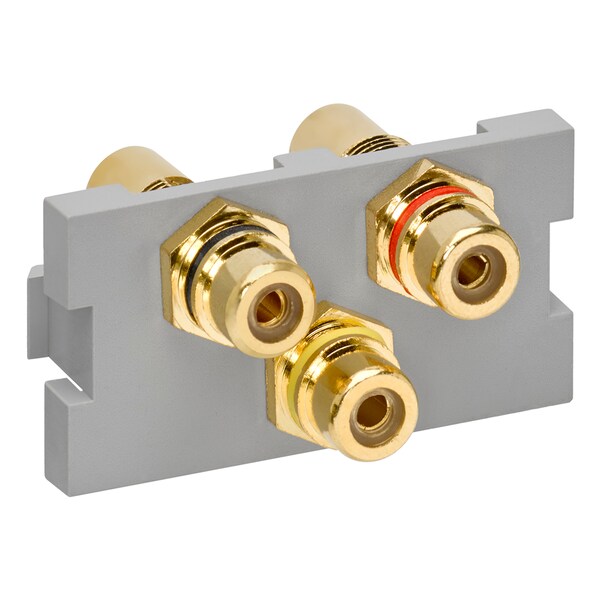 MOS Insert, 3-Port RCA Adapter, 1 unit high, grey. Female-to-female connections with red, white, and yellow barrel colors.