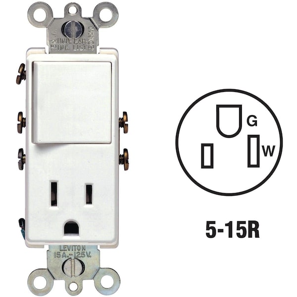Single pole switch and a 2-pole 3-wire grounded outlet in a single gang space. Switch: 15A/120V 1/2 HP-120V. Outlet: 15A/125V NEMA 5-15. UL (Underwriters Laboratories) listed.