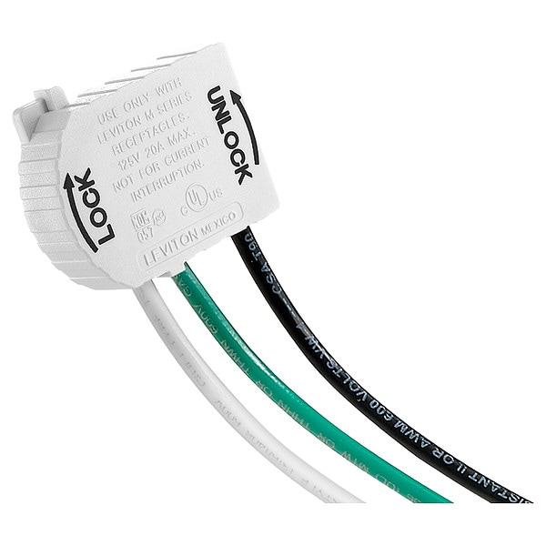 Receptacle Wiring Module, Connector Type Pigtail, Current Rating 20 A, For Use With Lev-Lok Receptacles, Lead Length 6 in, Number of Poles 2, Number of Wires 3, Voltage Rating 125V AC, Wire Size 12 AWG, Wire Type Stranded, Color White, Conductor Type THHN, Module Type Receptacle, Phase Single, Standards RoHS Compliant, UL E13399, Application Switches and Lighting Controls, Housing Color White, Housing Material Polycarbonate, Market Commercial, Industrial