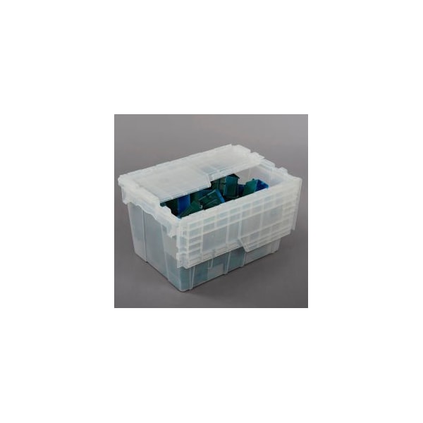 ORBIS CLEAR FLIPAKĀ® ATTACHED LID CONTAINER, 21-4/5X15-1/5X12-9/10 THESE IMPACT RESISTANT CLEAR POLYPROPYLENE STORAGE CONTAINERS ARE DESIGNED TO LAST AND PROVIDE INSTANT VISUAL INVENTORY. GREAT FOR USE IN DISTRIBUTION APPLICATIONS SUCH AS HEALTH AND BEAUTY AIDS, PHARMACEUTICALS, GROCERY AND GENERAL MERCHANDISE. CONTAINERS STACK UP TO 5 UNITS HIGH ON A 45" X 48" PALLET. INTERLOCKING, STRUCTURALLY REINFORCED LIDS ARE HINGED FOR EASY, SECURE CLOSURE. THESE ATTACHED LID CONTAINERS NEST WHEN OPEN AND FEATURE HANDGRIPS FOR EASY PORTABILITY. RECESSED COVER WITHIN THE PERIMETER PROTECTS AGAINST COVER BREAKAGE DURING TRANSPORT. QUICK-RELEASE LABEL AREAS FOR EASY IDENTIFICATION AND FAST LABEL CHANGE. FDA APPROVED.