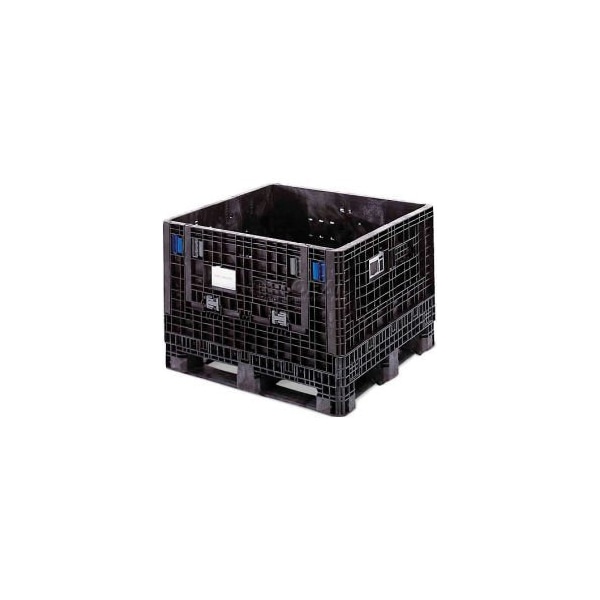 ORBIS BULKPAK GP4048-34 FOLDING BULK SHIPPING CONTAINER 48 X 40 X 34 2000 LB CAPACITY BLACK, DOOR IS LOCATED ON THE 40" SIDE. SHIPPING CONTAINERS ARE IDEAL FOR TRANSPORTING LARGE QUANTITIES OF PARTS FOR WORK-IN-PROCESS, STORAGE AND TRANSPORTATION APPLICATIONS. THESE BULK CONTAINERS FOLD WHEN EMPTY TO REDUCE COSTS ON RETURN FREIGHT AND STORAGE. STRUCTURALLY REINFORCED FOAM MOLDED HIGH DENSITY POLYETHYLENE RESISTS RUST, ODORS AND MOISTURE. FOLDING CONTAINERS ALLOW POSITIVE STACKING TO REDUCE FLOOR SPACE. REUSABLE PLASTIC CONTAINERS ARE STRUCTURALLY REINFORCED AT ALL STRESS POINTS FOR ADDED STRENGTH AND STABILITY. SMOOTH INTERIOR SURFACE CLEANS EASILY. LARGE, SPRING-LOADED ERGONOMIC LATCHES MAKE COLLAPSING CONTAINERS AND OPENING/CLOSING ACCESS DOORS EASY. FOLDING STORAGE CONTAINERS ALLOW CONVENIENT FOUR-WAY FORKLIFT ACCESS. OPTIONAL LID PROTECTS CONTENTS (SOLD SEPARATELY).