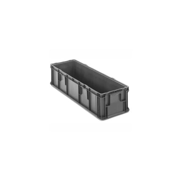 LONG STACKING BOXES DURABLE POLYETHYLENE CONSTRUCTION RESISTS CHEMICALS AND EXTREME TEMPERATURES. SMOOTH, STRAIGHT INTERIOR WALLS PROVIDE MAXIMUM CUBE UTILIZATION AND ALLOW FLEXIBLE DUNNAGE AND EASY MAINTENANCE. RIB REINFORCEMENT FOR ADDED STACKING STRENGTH. LONG BOX RIM FEATURES A LOCKING TAB FOR SECURE STACKING. 3.5 CUBIC FOOT CAPACITY. OVERALL DIMENSIONS: 48"L X 15"W X 10-4/5"H. ERGONOMIC HANDLES FOR COMFORT AND SAFETY.