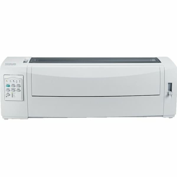 The LEXMARK Forms Printer 2581 is a dot matrix printer with a 9-pin configuration. It has a height of 7.7", a width of 25", and a depth of 11.4". It is powered by an AC supply.