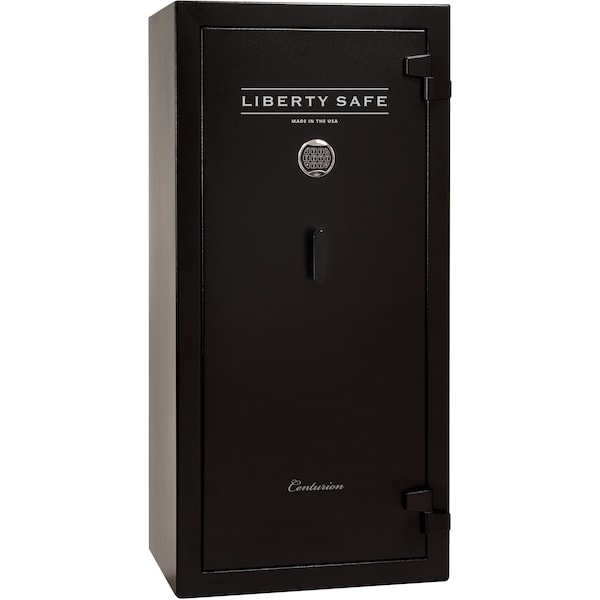 Centurion 24 Gun Safe, Textured Black w/Chrome Hardware, Gray Fabric Interior, 30 Minute Fire Rating. Includes Electronic Lock, 2-Way / 4” wide x 3/16” Military Style Locking Bars, 14-guage steel safe body, Economy Door Panel for extra storage, Duel Flex Interior, California-approved firearm security device.
