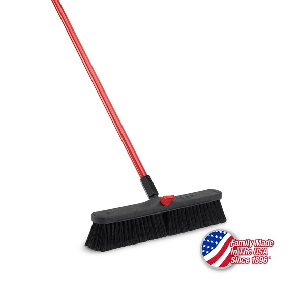 18O polymer broom block for durability and hygiene; 1O x 60O long steel, nylon thread handle with 5O handgrip, hanger hole and locking bolt; 3O long, soft staple-set flagged fibers; Firm but flexible long-lasting fibers made with recycled PET; Resin bolt locks handle in place; Set includes broom head and handle; Excellent for smooth concrete floors in warehouses and factories The 18 Smooth Sweep is best for fine debris on a very smooth surfaces including treated plant and warehouse floors. The Broom head is injection molded, durable polypropylene, and the fibers are sift, flagged stapled fibers.
