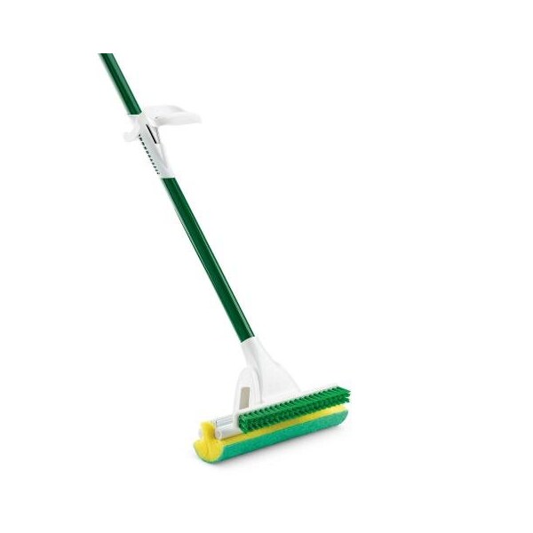 Features: 10" wide, tear resistant, synthetic sponge with raised cleaning circles. 3/4" steel handle. Total height of 51". 8-1/2" scrub brush with 3/4" long stiff bristles. easy pull back handle grip to wring. refill #2011