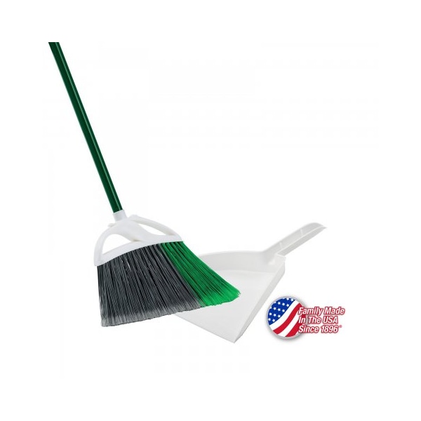 - 12" WIDE ANGLE BROOM WITH 53" TOTAL HEIGHT. LONGER LIFE, ENVIRONMENTALLY-FRIENDLY RECYCLED PET FIBER. 3/4" STEEL HANDLE WITH HANGER HOLE. SOLID ONE PIECE RESIN BLOCK. 6" LONG STAPLED FLAGGED FIBER. INCLUDES 10" SNAP-ON DUST PAN.