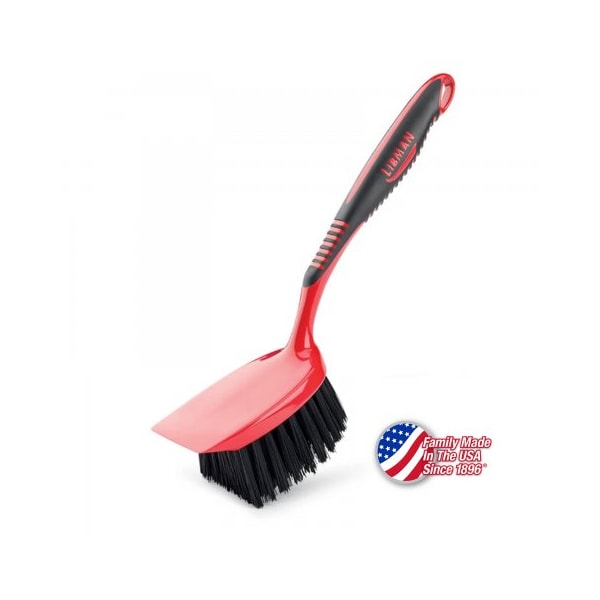Libman short handle utility brush - 3-1/2 x 4 scrubbing surface - 524 libman short handle utility brush has an ergonomic rubber grip handle for comfortable cleaning. 3 1/2 x 4 scrubbing surface. Stapled 2 polymer fiber bristles with resin block. 80% recycled pet plastic bristles. 2 1/2 wide scraper edge for tough cleaning. Handle includes hanger hole.