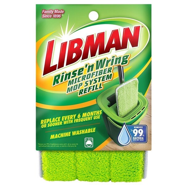 The Libman Rinse 'n Wring microfiber refill is the ideal addition to your Rinse 'n Wring mopping system. Keep your floors, walls and windows in peak condition by adding additional refills to keep existing ones fresh. The pads are machine washable for continual use. The microfiber material is soft enough for delicate surfaces and durable enough for hardwood floors, tile and more.