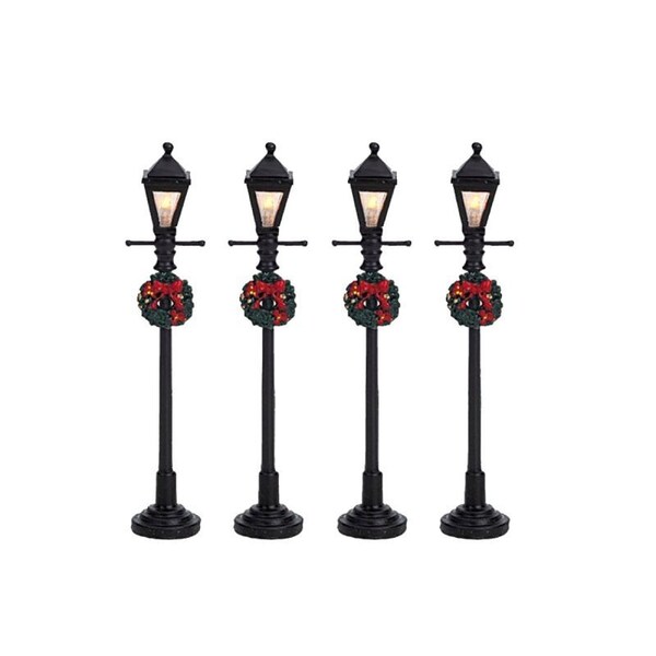 Add classic black, cast-iron-like Gas Lantern Street Lamp to a Christmas Village scene and you'll have a source of light and a vintage, eye-catching feature. Each lamp, which come in a set of four, features a festive wreath and a bright, working light.