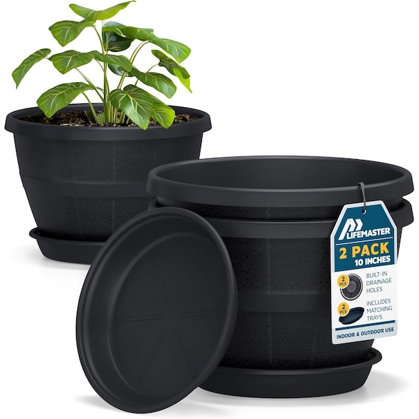 10-Inch Whiskey Barrel Planters, Durable Plastic Pots with Drainage and Saucer, 2PK