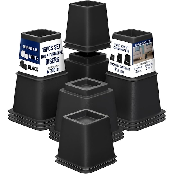 Adjustable Bed Risers, 3in and 5in Heights, Heavy Duty, 1300lbs Support, Black, 16PK