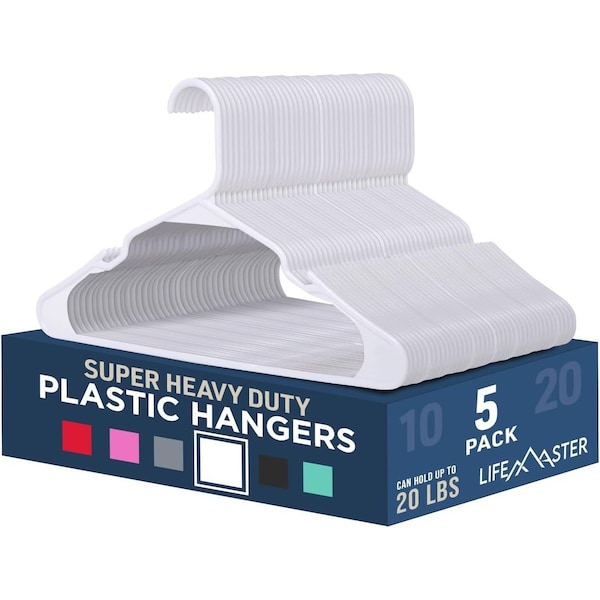 Heavy-Duty Plastic Hangers, Non-Slip, Space-Saving, Holds 5 lbs, White, 5PK