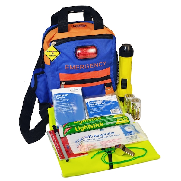 A High-Visibility teacher and staff Mini-Backpack emergency response kit with a Bleeding Control Kit to treat bleeding wounds. Includes a MobileAid BleedStop Compact 200 Bleeding Control Kit with a SOFT-W tourniquet, a mini-compress bandage, QuickClot blood clotting gauze, petroleum gauze for chest wounds, and other bleeding wound supplies. Emergency kit includes supplies that provide: identification, communication, breathing protection, light, and personal & group safety. FOR EASY IDENTIFICATION, SAFETY & RESCUE SIGNALING — "EMERGENCY" marking, integrated LED emergency flasher (2 AAA batteries not included) and 180 degree reflective and high-visibility markings. FOR HANDS-FREE RESPONSE — Mini-Backpack (with adjustable sling and shoulder strap options) ensures a comfortable and functional fit. Dual grab handles provide for easy hand carry option. FOR QUICK-ACCESS ORGANIZATION — Three main zippered compartments, quick-access side gear pocket, mesh water bottle carrier, and four gear-attach D-rings keep supplies organized and at the ready. FOR DURABILITY and PROTECTION of SUPPLIES — This rugged sling and shoulder bag is made of durable 600 Denier Polyester to provide tough protection for your emergency supplies. FOR EMERGENCY INFORMATION –Integrated card holder on back of bag can hold a business card, other ID, or emergency information. COMPACT STORAGE: Stores easily on shelves or in drawers or cabinets. Contents: TEACHER AND STAFF KIT SCHOOL EMERGENCY KIT (1) Hi-Visibility Mini-Backpack (with dual grab handles and option to use adjustable sling and shoulder strap) with Emergency LED Flasher Signal (detachable) – [2 AAA batteries not included] (1) Hi-Visibility Safety Vest (1) disposable protective face mask (1) Whistle with lanyard (1) Pen (1) Writing tablet (1) Leather Palm Gloves (1) Emergency poncho (1) Emergency thermal blanket (1) Heavy Duty Flashlight (2) D batteries (2) 12-Hour Light Sticks(1) LED Emergency signal (detachable from mini-backpack) with belt clip MOBILEAID BLEEDSTOP COMPACT 200 BLEEDING CONTROL KIT (1) SecureLock Clear Bag (1) Instructions (1 pair) Blue Nitrile Gloves (2) QuickClot Hemostatic GAUZE (1) Mini-Compress Bandage (1) SOFT-W tourniquet (1) Permanent Marker (1) Petroleum Gauze (1)Tape (2) Moist Towelettes (1) Biohazard Bags Dimensions: LIFESECURE SCHOOLGUARD HIGH-VISIBILITY MINI-BACKPACK 10.5" x 8" x 5" MOBILEAID BLEEDSTOP COMPACT 200 BLEEDING CONTROL KIT 7" x 5.5" x 1.5" Weight: 5.75 lbs.