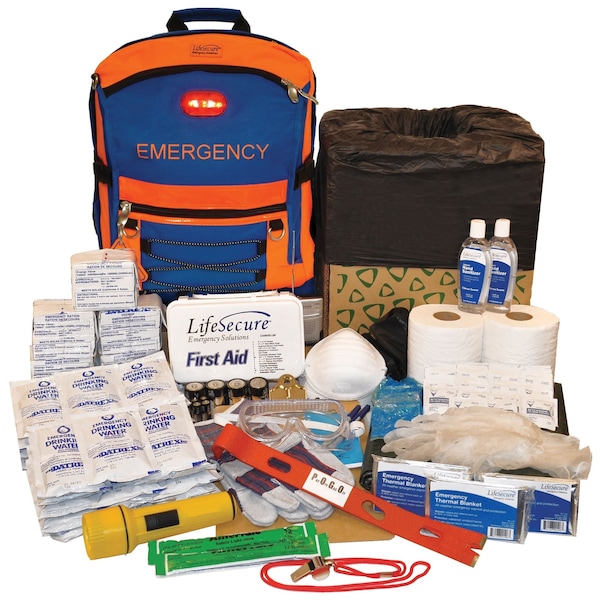 A portable emergency survival kit for evacuating up to 30 people or supporting them in place for several hours after an emergency or disaster. Emergency survival backpack with high-visibility markings and LED safety signal provides added safety in use. Portable fold-flat toilet stores in the survival backpack with other survival suppliesMOBILE — Emergency gear kits are packed in a SecurEvac backpack with padded shoulder straps, top carry handle, and sternum strap for stability in motion.