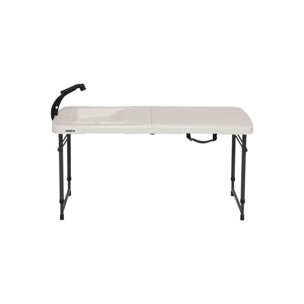 Lifetime 4-foot fillet table - almond the 4-foot fold-in-half fillet table from lifetime products is perfect for fishing, camping, or backyard use. This unique table has a pull out spray handle that hooks directly to your hose and has 2 different spray settings and an on/off switch. The table top is specially designed with a molded in channel so that you do not loose any water. The table includes storage on the underside for the drain hose and spray handle. Also includes a rubber drain stopper. The table surface is stain resistant, easy to clean, and uv-protected, and the sturdy steel frame has a powder-coated finish that protects against weather, rust, and corrosion. The table also has a convenient fold-in-half design with a carry handle for easy transport and storage, a ruler molded into the top, and three adjustable height settings (22.5 in., 29.5 in. 36.5 in.). features: steel frame with all-weather finish designated storage for accessories spray nozzle with flow control convenient carry handle ruler molded into table top attaches to a standard garden hose integrated channels for water drainage stain resistant and easy to clean folds in half for easy transport and storage washbasin with an integrated drain and plug uv-protected high-density polyethylene (hdpe) top dimensions (open): 49.1"l x 24.1"w x 22.5"-36.5"h dimensions (folded): 25"l x 24.1"w x 4.1"h