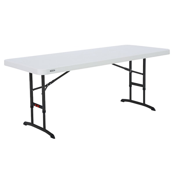 Lifetime plastic folding table is durable, yet lightweight for easy set up. Lifetime Folding Table features double wall, 2 thick high density polyethylene top for long life. UV-Protected High-Density Polyethylene HDPE Top. Moisture proof and stain resistant. Rust resistant powder coated steel framing for extra strength. Folds to 2 for easy storage. Table adjusts in 3 height settings - 24H, 29H or 36H. Indoor/outdoor use. Exceeds ANSI/BIFMA Standards.