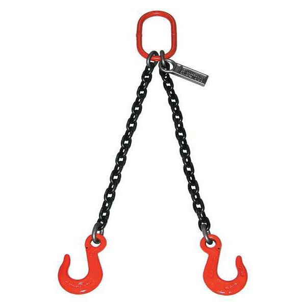 Double Leg Chain Sling, Sling Type DOS, Sling Material Alloy Steel, Chain Adjustability Fixed, Chain Grade 100, Chain Trade Size 7/32 in, Sling Length 12 ft, Number of Legs 2, Sling Leg Length 12 ft, Load Capacity @ 30 Degrees 2,700 lb, Load Capacity @ 45 Degrees 3,800 lb, Load Capacity @ 60 Degrees 4,700 lb, Hook Opening Width 21/64 in, Load Capacity @ 90 Degrees Not Applicable, Hook Type Included Sling Hook, Master Link Inside Length 3 in, Master Link Inside Width 1 1/2 in, Chain Color Black