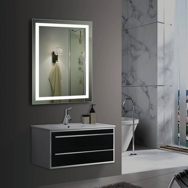 Wide clean lines complement LED (light emitting diode) light source on all four sides of the mirror. Mirror can be installed vertically or horizontally with the keyhole installation. Frameless PVC (polyvinyl chloride) film backed 5mm mirror with frosted pattern on two sides.