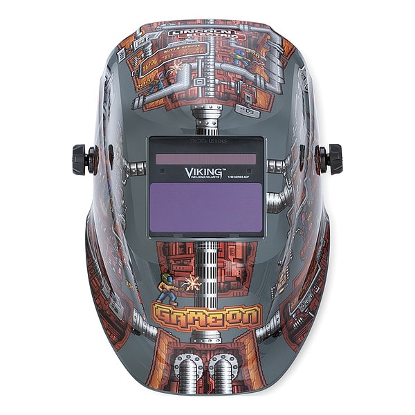 Welding Helmet, ADF Controls Analog, Battery Chemistry Alkaline, Battery Type AAA, Color Gray, Orange, Red, Compatible Suspension Brand Name Lincoln Electric Ratchet Style Headgear, Compatible Suspension Manufacturer Part Number KP3047-1, KP3486-1, EN379 Classification 1/1/1/1, Features 1/1/1/1 Optical Clarity, 3-point Pivot Headgear, 4C Lens Technology, Auto-Darkening Viewing Area, Grind Mode with LED Safety Indicator, Lightweight, Variable 9-13 Shade, Graphics Game On, Grind Mode Yes