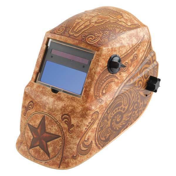 Welding Helmet, ADF Controls Digital, Battery Life 3,000 hr, Battery Type AAA, Color Tan, EN379 Classification 1/1/1/2, Features Continuously Variable External Control For Shades, Lightweight, Graphics Lone Star, Grind Mode Yes, Helmet Material Thermoplastic, Helmet Type Auto-Darkening, Includes (2) Extra Inside And Outside Clear Cover Lenses, Includes Batteries Yes, Lens Color Clear, Light State 7, Magnification No, Number of Arc Sensors 2, Power Source Solar, Series 725S