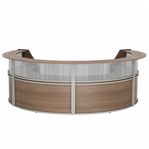 Curved Reception Desk 4 Units, Clear Panel, 142 inW x 107 inD, N. Walnut