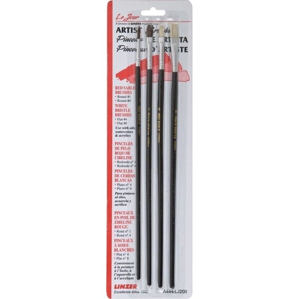 Contains four long handled brushes, 1 each: #1 red sable round, #4 red sable bright, #4 white bristle flat and #8 white bristle bright.