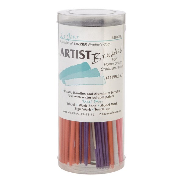 Camel hair with plastic handle. Assorted widths. For water colors and school projects. Plastic cylinder. Consumer grade.
