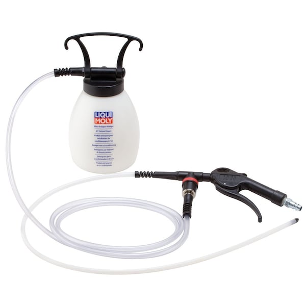 Aspecial tool for the application of the LIQUI MOLY A/C System Cleaning Fluid (part no. 20001). Produces a circular spray pattern to allow proper cleaning of evaporator. The reservoir uses a quick connector for easy hook-up and handling during application.
