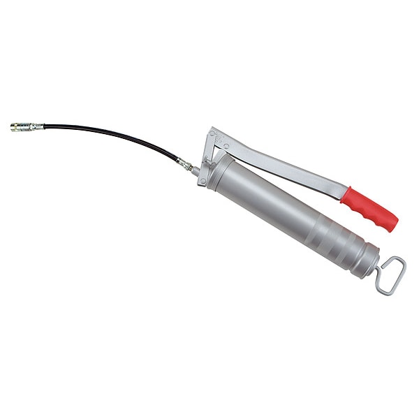 Manual Grease Gun, Grease Gun Loading Method Bulk, Grease Gun Handle Style Lever, Nozzle Extension Type Flex Hose, Strokes per Oz. 21, Max. Operating Pressure 5,800 psi, Bulk Capacity 16 oz, Hose Length 12 in, Gray, Tube Material Steel, Tether Style Standard Tool (Accessory Needed for Tethering), Variable Stroke / Full Stroke Variable Stroke, 1 oz, Tool Length 15 in, For Use With Light Oils And Flowable Greases, Application Gear Boxes, Small Transmissions, Unions