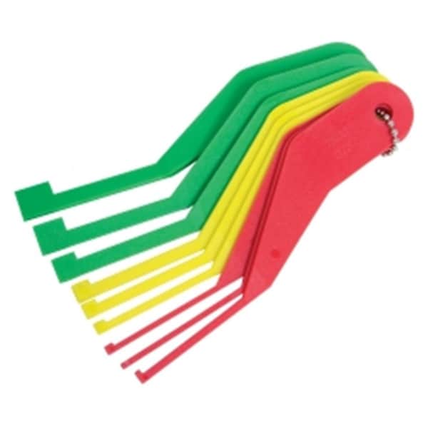 Features -The 9 piece manual brake gauge set allows brake pad wear to be accurately and consistently measured without guessing -Designed to check both straight on or at a 90° angle to the rotor with offset tips so the gauges can be used without removing the wheel or caliper assembly on many applications -Brake lining gauges identify thickness levels for brake lining inspection -Made from durable flexible acetal -The gauges are color coded to match sae or metric recommendations for brake pad replacement Specifications - Dimension: 1 x 6 x 9 in. - Weight: 1 lbs