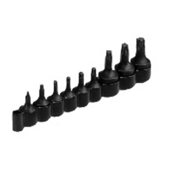 All Torxbits are made of heat-treated alloy steel.9 pc. Set includes T-10 through T-50. T-10 through T-30 are 1/4" drive. T-40 through T-50 are 3/8".