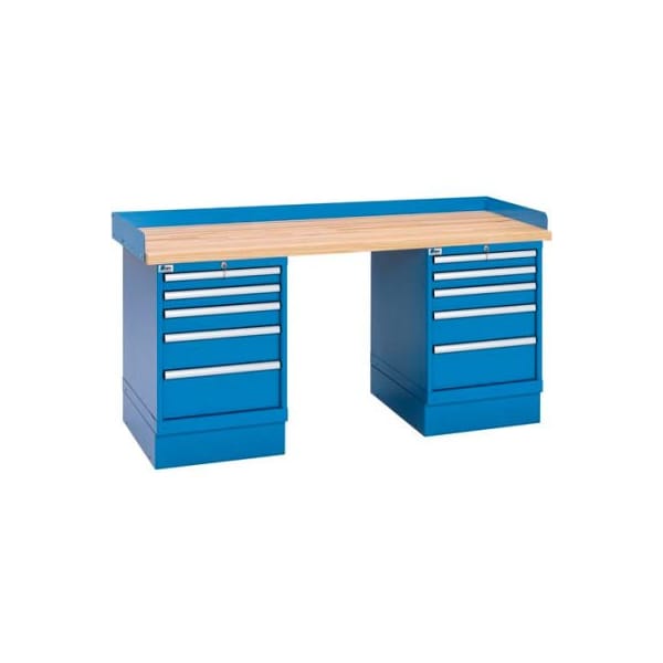 Rugged, durable industrial workbench stands up to the toughest environments. typical applications include maintenance and repair, tool room, quality and shop floor. Features 35-1/4" work surface height. Includes 2 drawer cabinet pedestals with 10 drawers: (4) 2" (2) 3" (2) 5" (2) 7", and 106 drawer compartments. Drawers have 150 lb. Drawer weight capacity. Includes back and end stops, and 2 individual removable core locks with 2 pairs of keys. Assembly required.