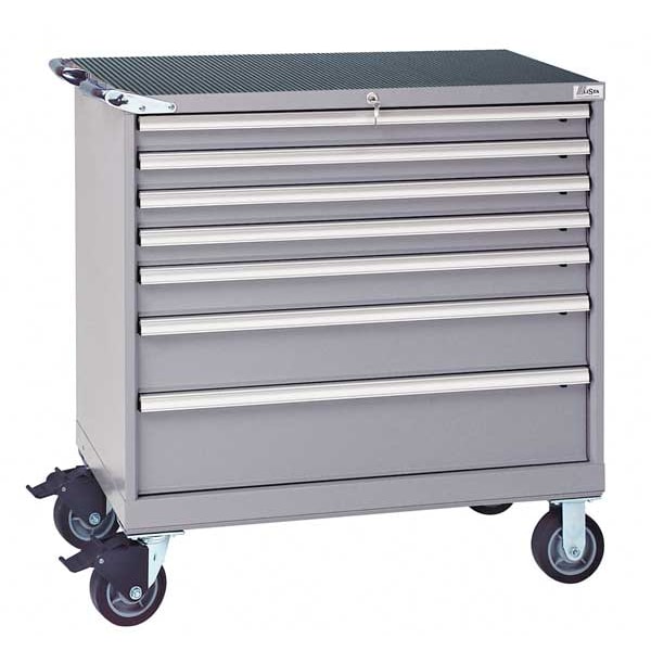 Modular Drawer Cabinet, Base Type Casters, Adjustable Dividers Yes, Cabinet Color Gray, Cabinet Storage Components Drawers, Drawer Height 2 in, 3 in, 5 in, 7 in, Includes Dividers Yes, Number of Compartments per Drawer (1) 12, (1) 18, (1) 6, (2) 12, (2) 17, Number of Drawers 7, Overall Depth 22 1/2 in, Overall Height 41 5/8 in, Overall Width 40 1/4 in, Lock Type Keyed, Mobility Mobile, Mounting Location Freestanding, Number of Compartments 94, Cabinet Finish Powder Coated, Cabinet Material Steel