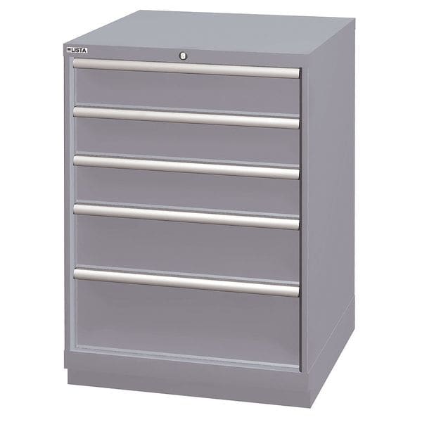 Modular Drawer Cabinet, Base Type Frame, Adjustable Dividers Yes, Cabinet Color Gray, Cabinet Storage Components Drawers, Drawer Height 5 in, 7 in, 9 in, Includes Dividers Yes, Number of Compartments per Drawer (1) 4, (1) 9, (3) 16, Number of Drawers 5, Overall Depth 28 1/2 in, Overall Height 39 3/8 in, Overall Width 28 1/4 in, Method of Construction Welded, Mobility Stationary, Number of Compartments 61, Cabinet Finish Powder Coated, Cabinet Material Steel, Drawer Access Single