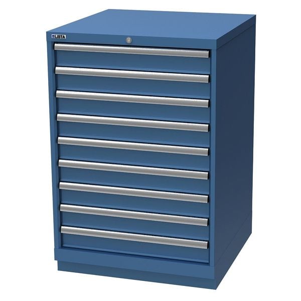 Modular Drawer Cabinet, Base Type Frame, Adjustable Dividers Yes, Cabinet Color Bright Blue, Cabinet Storage Components Drawers, Drawer Height 3 in, Includes Dividers Yes, Number of Compartments per Drawer (3) 16, (3) 20, (3) 24, Number of Drawers 9, Overall Depth 28 1/2 in, Overall Height 39 3/8 in, Overall Width 28 1/4 in, Method of Construction Welded, Mobility Stationary, Number of Compartments 180, Cabinet Finish Powder Coated, Cabinet Material Steel, Drawer Access Single
