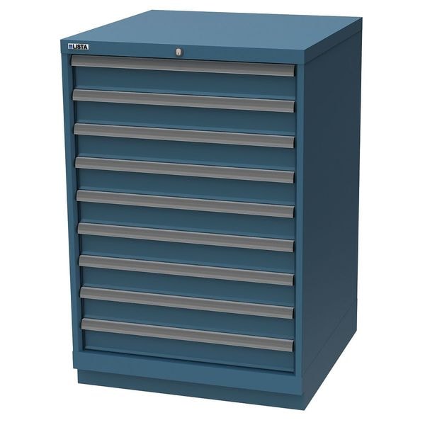 Modular Drawer Cabinet, Base Type Frame, Adjustable Dividers Yes, Cabinet Color Classic Blue, Cabinet Storage Components Drawers, Drawer Height 3 in, Includes Dividers Yes, Number of Compartments per Drawer (3) 16, (3) 20, (3) 24, Number of Drawers 9, Overall Depth 28 1/2 in, Overall Height 39 3/8 in, Overall Width 28 1/4 in, Method of Construction Welded, Mobility Stationary, Number of Compartments 180, Cabinet Finish Powder Coated, Cabinet Material Steel, Drawer Access Single