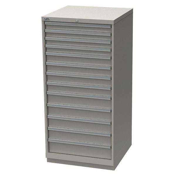 Modular Drawer Cabinet, Base Type Frame, Adjustable Dividers Yes, Cabinet Color Gray, Cabinet Storage Components Drawers, Drawer Height 2 in, 3 in, 4 in, 5 in, Includes Dividers Yes, Number of Compartments per Drawer (1) 12, (4) 18, (4) 21, (4) 36, Number of Drawers 12, Overall Depth 28 1/2 in, Overall Height 57 1/8 in, Overall Width 28 1/4 in, Method of Construction Welded, Mobility Stationary, Number of Compartments 210, Cabinet Finish Powder Coated, Cabinet Material Steel