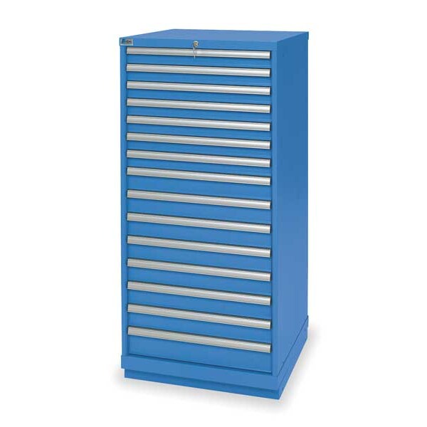 Modular Drawer Cabinet, Base Type Frame, Adjustable Dividers Yes, Cabinet Color Bright Blue, Cabinet Storage Components Drawers, Drawer Height 2 in, 3 in, 4 in, Includes Dividers Yes, Number of Compartments per Drawer (1) 12, (7) 15, (7) 18, Number of Drawers 15, Overall Depth 28 1/2 in, Overall Height 57 1/8 in, Overall Width 28 1/4 in, Lock Type Keyed, Method of Construction Welded, Mobility Stationary, Number of Compartments 300, Cabinet Finish Powder Coated, Cabinet Material Steel