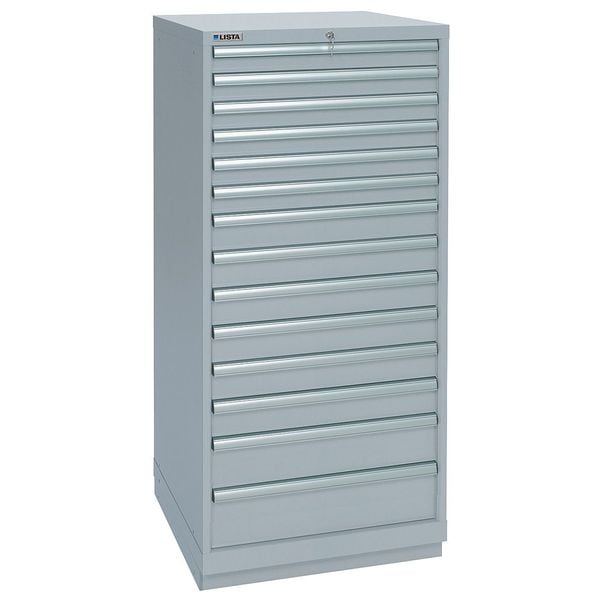 Modular Drawer Cabinet, Base Type Frame, Adjustable Dividers Yes, Cabinet Color Gray, Cabinet Storage Components Drawers, Drawer Height 2 in, 3 in, 5 in, Includes Dividers Yes, Number of Compartments per Drawer (2) 12, (6) 15, (6) 18, Number of Drawers 14, Overall Depth 28 1/2 in, Overall Height 59 1/2 in, Overall Width 28 1/4 in, Method of Construction Welded, Mobility Stationary, Number of Compartments 282, Cabinet Finish Powder Coated, Cabinet Material Steel, Drawer Access Single