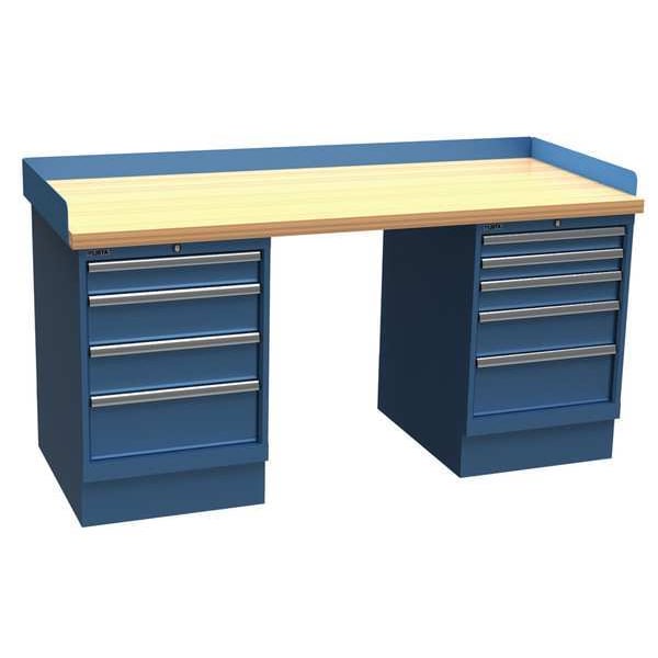 Workbench, Height Adjustability Fixed Height, Top Material Butcher Block, Assembly Fully Assembled, Color Blue, Frame Material Steel, Leg Type Pedestal Cabinet Base, Maximum Adjustable Height Not Applicable, Minimum Adjustable Height Not Applicable, Non-Metal Top Thickness 1 3/4 in, Number of Cabinets 2, Number of Drawers 9, Included Components Back Stop, Side Stops, Number of Outlets 0, Number of Shelves 0, Overall Depth 30 in, Overall Fixed Height 35 1/4 in, Overall Load Capacity 1,000 lb