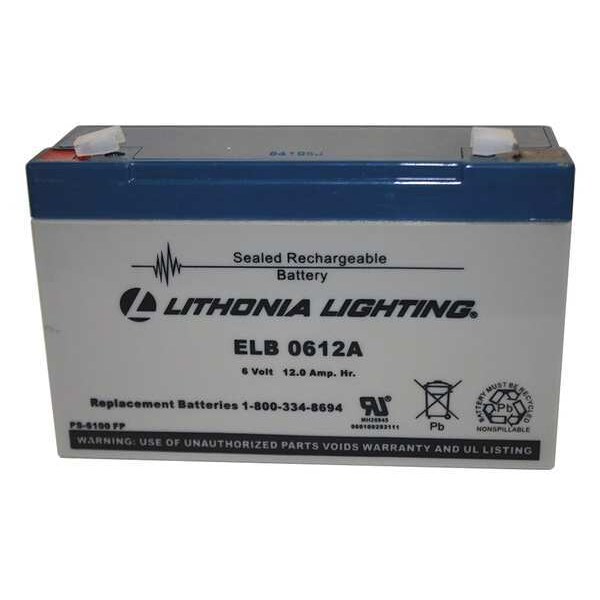 Battery, Battery Chemistry Sealed Lead Acid, Battery Capacity 12 Ah, Compatible with Product Type Emergency Lights, Recharge Time 72 hr, Voltage 6 V, Slip On Terminal Type, 250 and 187 Flag Terminal Connection, Rated Life 5 yr, Black Housing Color, Compatible Mfr. Model Number ELM1254, ELM1272, ELM627, ELM654, IND1236, IND1254, IND618, IND636, IND654, INDX1236, INDX1254, INDX618, INDX654, Overall Depth 2 in, Overall Height 3 3/4 in, Overall Width 6 in
