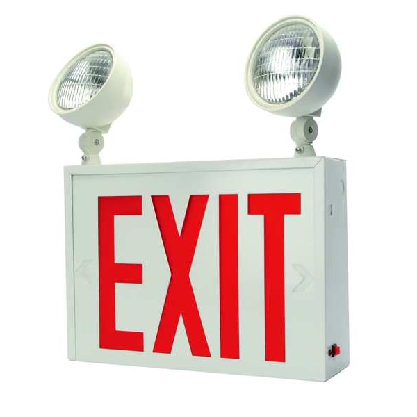 Exit Sign with Emergency Lights, Letter Color Red, Number of Faces 1, Directional Indicators - Emergency Lighting and Exit Signs Universal Field Selectable Chevrons, Light Source- Emergency Lighting and Exit Signs LED, Housing Material - Emergency Lighting and Exit Signs Steel, Housing Color - Emergency Lighting and Exit Signs White, Battery Chemistry Lead Calcium, Voltage - Emergency Lighting and Exit Signs 120/277, Number of Lamp Heads 2